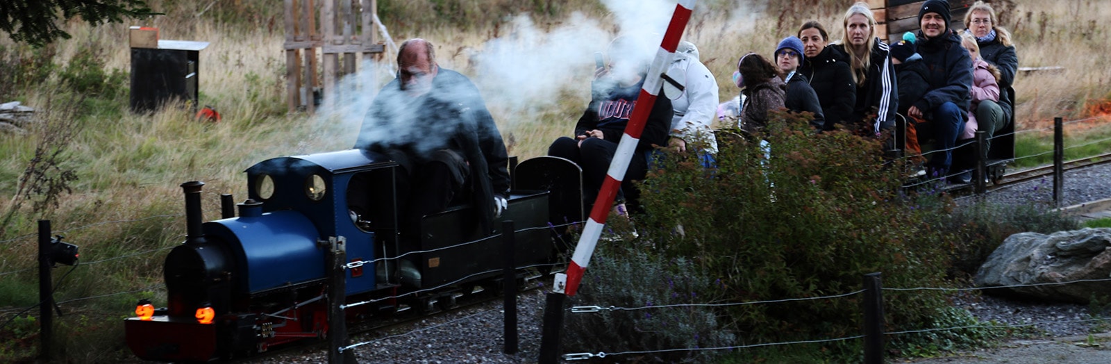 Forældre og børn sidder på række bag et lille damplokomotiv, der tøffer forbi skeletter og græskar i massevis, mens uhyggelige toner og ulvehyl fylder luften.